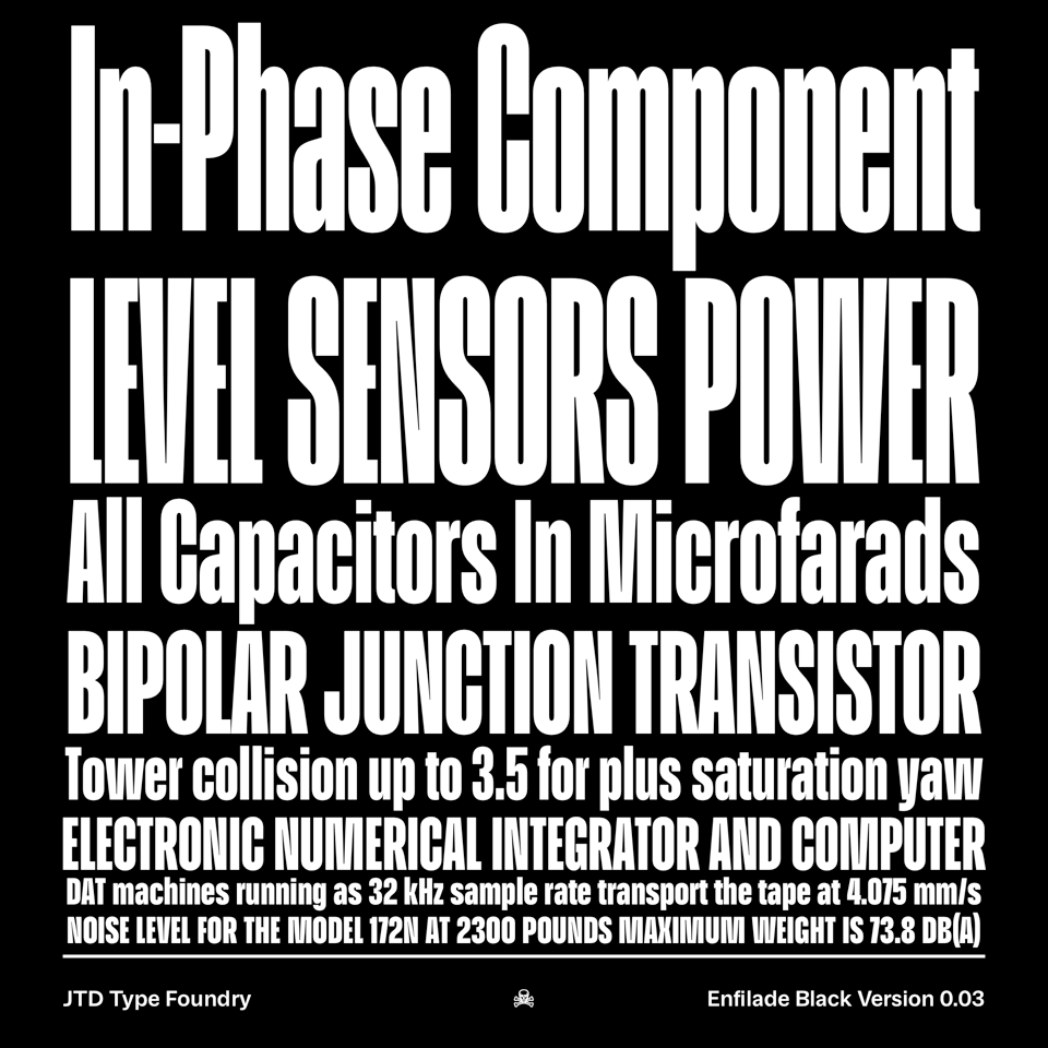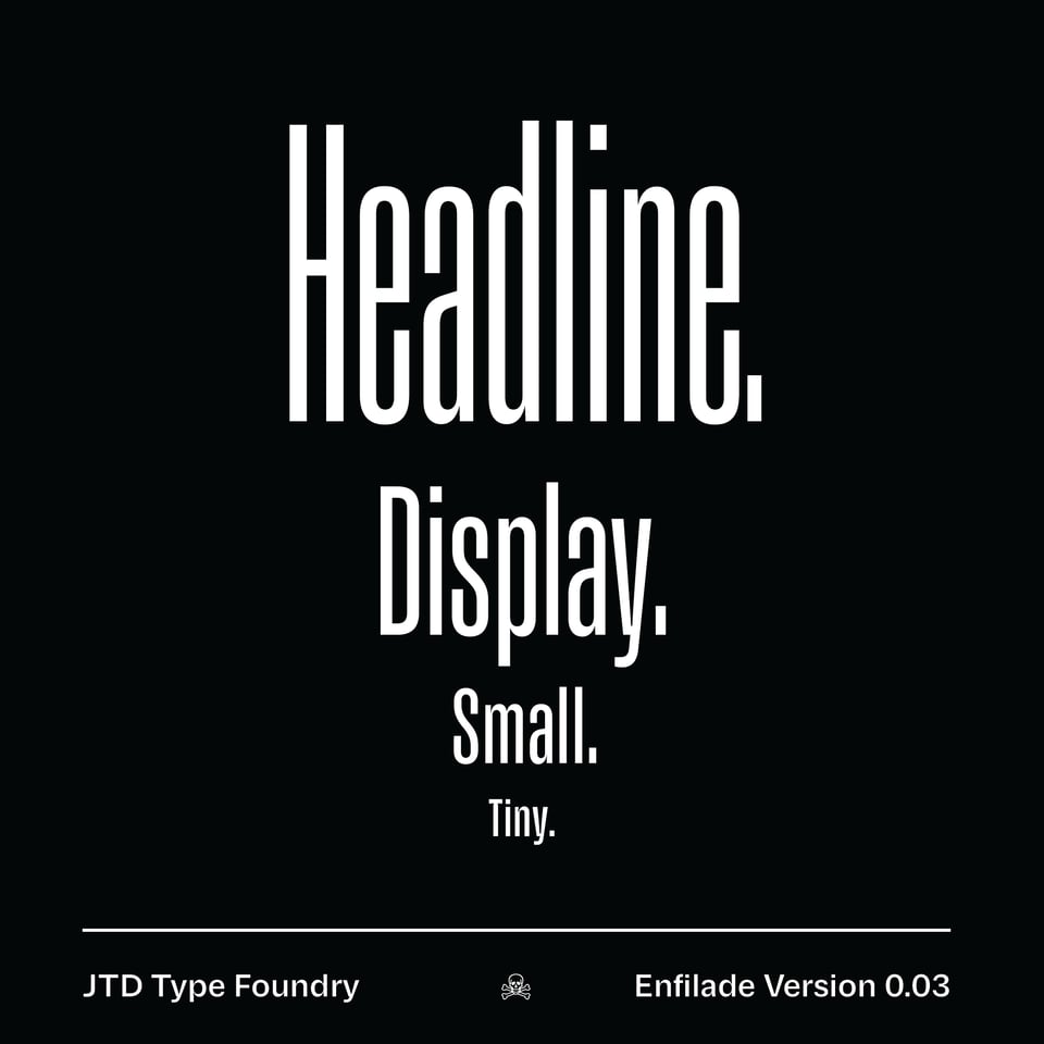 If you don’t know what the deal is with Enfilade, it’s a condensed sans serif (and a spiritual condensed version of our Parabolica sans serif), that has four optical sizes. Each optical size is designed to work at half the point size of the previous one.